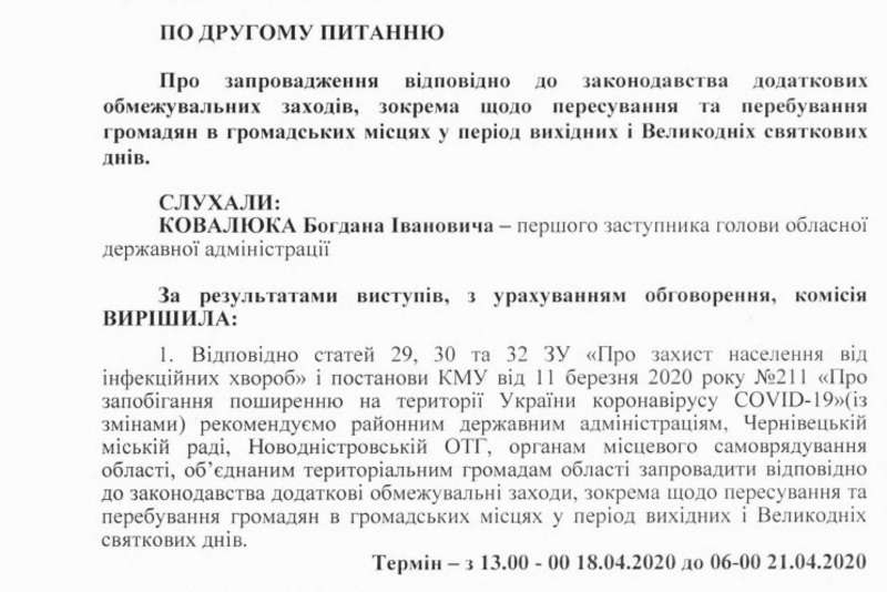 Згідно з інформацією, оприлюдненою у відповідному протоколі комісії, рішення передбачає “рекомендувати районним державним адміністраціям, Чернівецькій міській раді, Новодністровській ОТГ, органам місцевого самоврядування та об’єднаним територіальним громадам запровадити відповідно до законодавства додаткові обмежувальні заходи, зокрема щодо пересування та перебування громадян в громадських місцях у період вихідних і Великодніх святкових днів”. Тимчасові обмеження діятимуть з 13:00 18 квітня до 6:00 21 квітня.