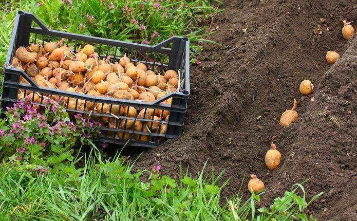 • Картоплини висаджують у невеликі ямки, вириті у місцях надрізів, і злегка присипають їх ґрунтом.