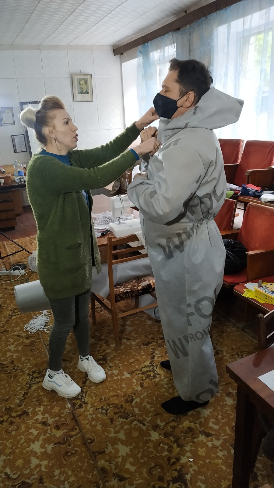 За готовими лекалами, вирізують частини костюма, потім ретельно все підганяють та підгинають, щоб ніде не було прогалини. Щоб не дати вірусу ані найменшого шансу пролізти під костюм та вразити людину.