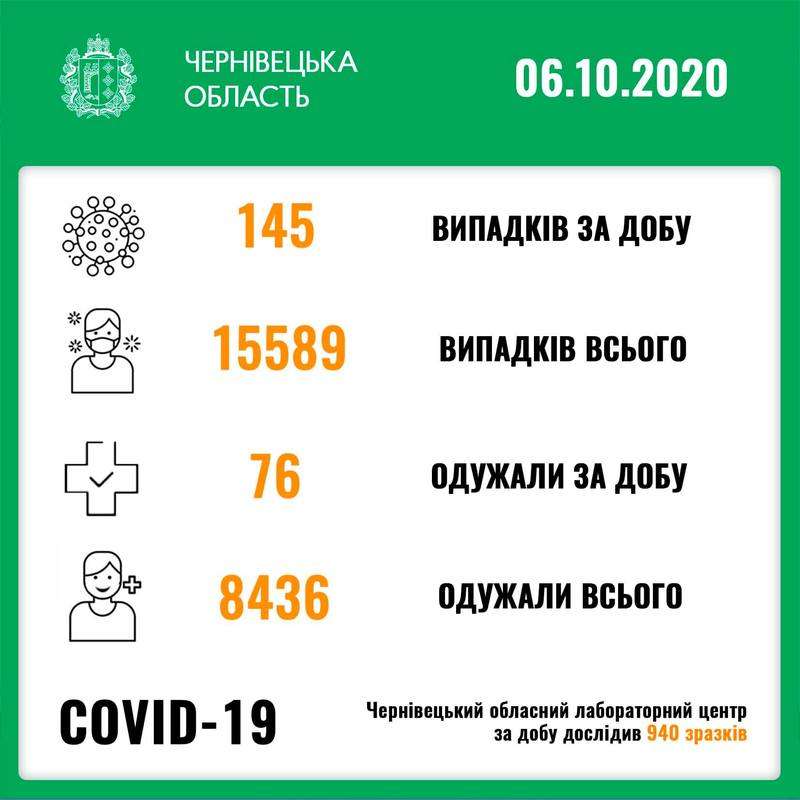 Одужали цього дня 76 осіб. Таким чином з початку пандемії у Чернівецькій області діагностували 15589 випадків захворювання на коронавірус. За цей час вилікувались 8436 хворих.