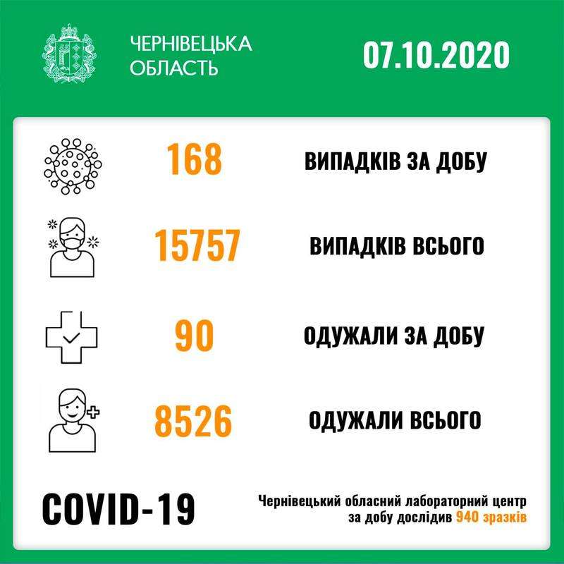 Одужали цього дня 90 осіб. Таким чином з початку пандемії у Чернівецькій області діагностували 15757 випадків захворювання на коронавірус. За цей час вилікувались 8526 хворих.