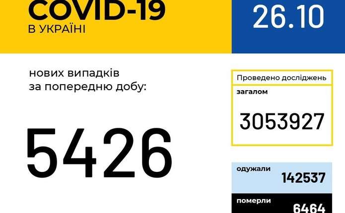 26 жовтня 2020 року (станом на 9:00) в Україні 348 924 лабораторно підтверджених випадки COVID-19, із них 6 464 летальних, 142 537 пацієнтів одужали. За добу зафіксовано 5 426 нових випадків. Загалом проведено 3 053 927 тестувань методом ПЛР. За добу одужали 1 029 пацієнтів. Про це повідомляє телеграм-канал Коронавірус Інфо.