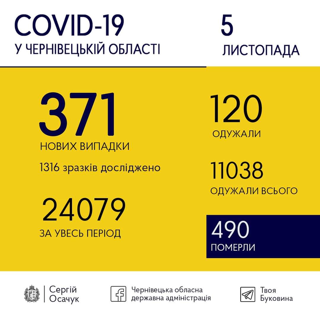 Станом на 6 листопада у Чернівецькій області виявили 371 новий випадок коронавірусу. Одужали за минулу добу 120 осіб.