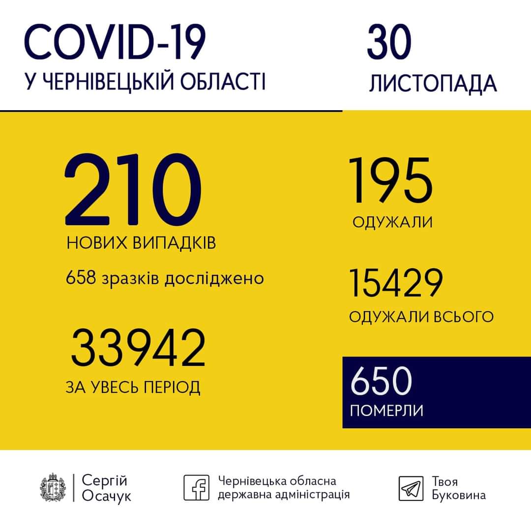 Станом на 1 грудня у Чернівецькій області виявили 210 нових випадків коронавірусу. Одужали за добу 195 людей.