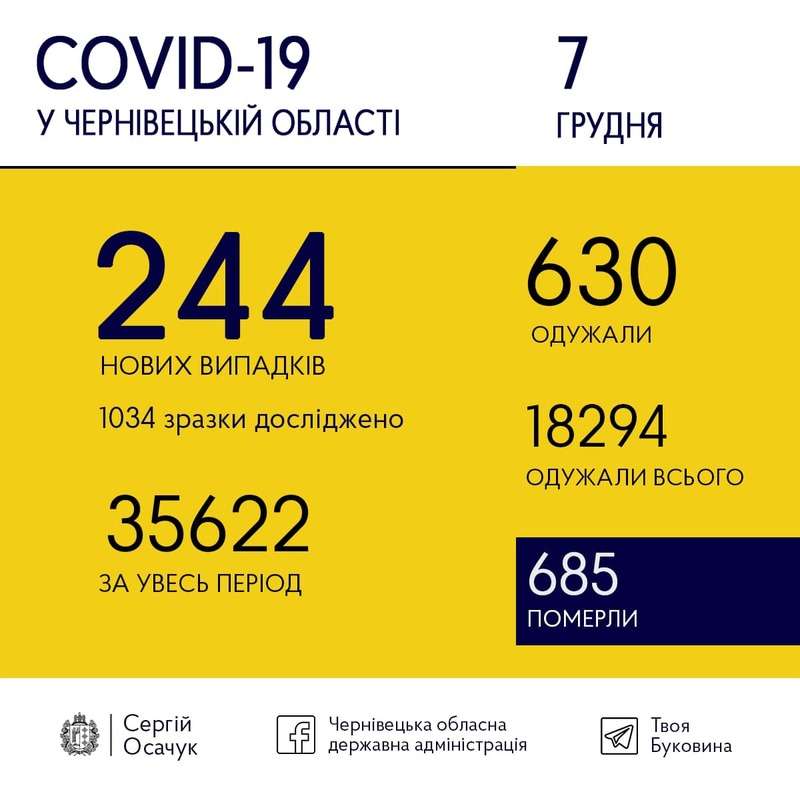 7 грудня у Чернівецькій області виявили 244 нових випадки коронавірусу.