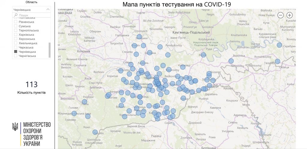 За даними цієї мапи, у Чернівецькій області є 113 пунктів тестування. Карту можна переглянути за посиланням.