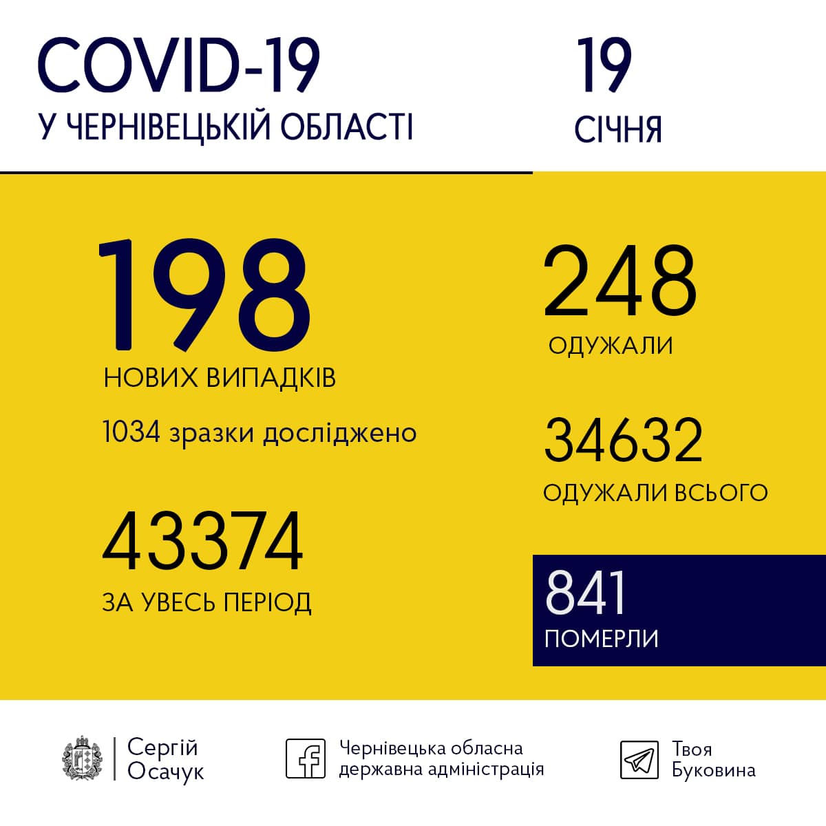 За минулу добу, 19 січня, у Чернівецькій області зафіксували 198 нових випадків коронавірусного захворювання COVID-19. Таким чином, загальна кількість хворих сягнула 43 374. З них 34 632 вже побороли хворобу. Зокрема 248 — за минулу добу. 19 січня Чернівецький обласний лабораторний центр дослідив 1 034 зразки. Про це на своїй сторінці у фейсбуку повідомив голова Чернівецької ОДА Сергій Осачук.
