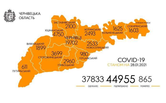 За весь період (станом на 28 січня 2021 р.) у Чернівецькій області підтверджено 44955 випадків зараження коронавірусом, повідомляє Чернівецька ОДА.