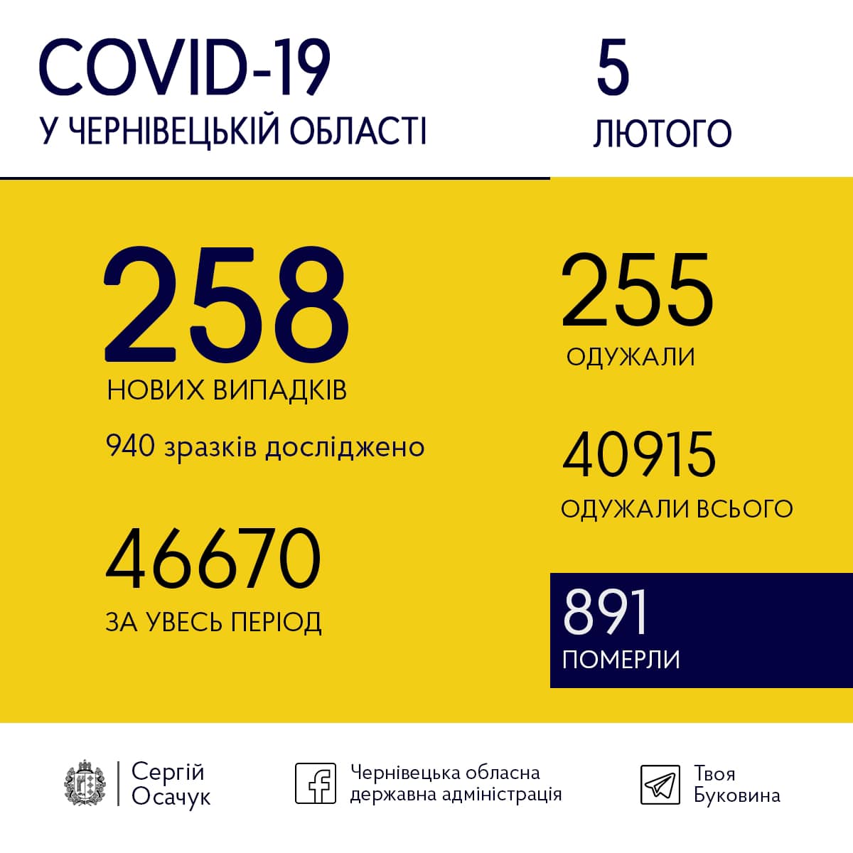 За минулу добу, 5 лютого, у Чернівецькій області зафіксували 258 нових випадків коронавірусного захворювання COVID-19. Таким чином, загальна кількість хворих сягнула 46 670. Із них 40 915 уже побороли хворобу. За минулу добу від недуги вилікувалися 255 буковинців. За добу Чернівецький обласний лабораторний центр дослідив 940 зразків. Про це на своїй сторінці у фейсбуку повідомив голова Чернівецької ОДА Сергій Осачук.