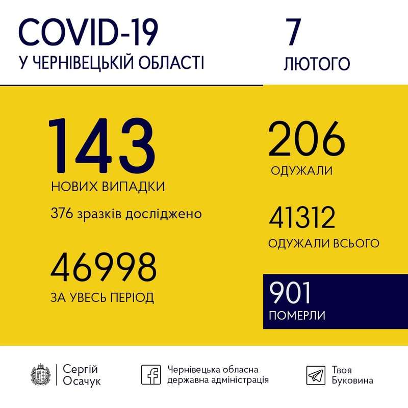 7 лютого на Буковині виявили 143 нових випадки коронавірусу.