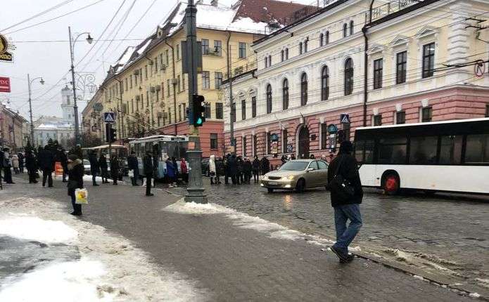 У центрі Чернівців, поблизу обласного театру ляльок, група пасажирів заблокувала рух транспорту на пішохідному переході. Протест виник раптово і не був спланований.