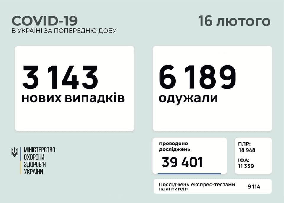 А в Україні 15 лютого зафіксували 3 143 нових випадків коронавірусної хвороби COVID-19. Зокрема, захворіли 182 дитини та 179 медпрацівників.
