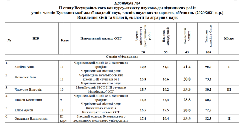 Вперше в конкурсі-захисті НДР (секція «Медицина») взяла участь студентка ІІІ курсу фахового коледжу Буковинського державного медичного університету Владислава Орлецька, зайнявши почесне ІІ місце. Про це йдеться на сайті БДМУ.