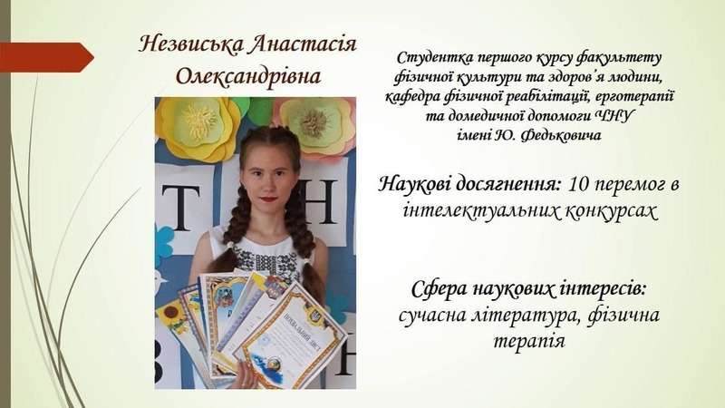 - Анастасія Незвиська – студентка першого курсу факультету фізичної культури та здоров’я людини, кафедра фізичної реабілітації, ерготерапії та домедичної допомоги ЧНУ імені Юрія Федьковича (ІІ місце, секція «Зарубіжна література»).