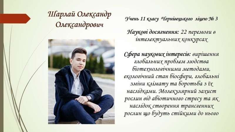 - Олександр Шарлай – учень 11 класу Чернівецького ліцею №3 медичного профілю (ІІ місце, секція «Загальна біологія»);