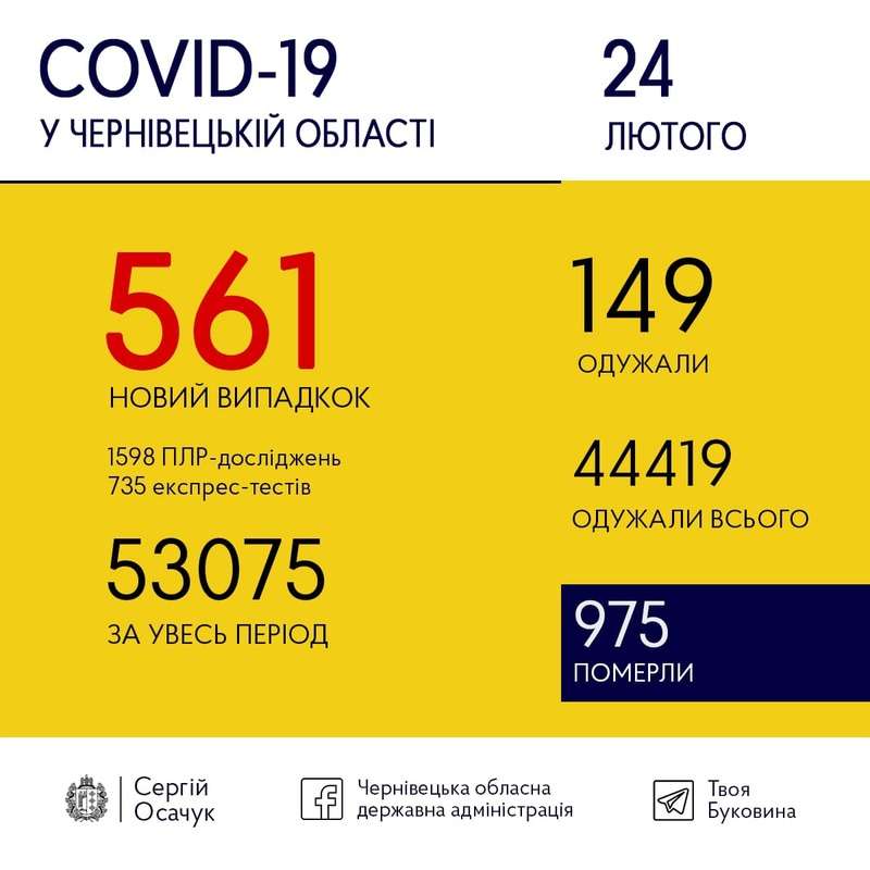 24 лютого на Буковині виявили 561 новий випадок коронавірусу.