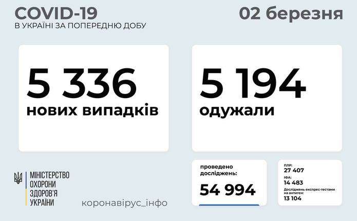 5 336 нових випадків коронавірусної хвороби COVID-19 зафіксовано в Україні станом на 2 березня 2021 року. Зокрема, захворіли 308 дітей та 218 медпрацівників. Про це інформує телеграм-канал Коронавірус Інфо.