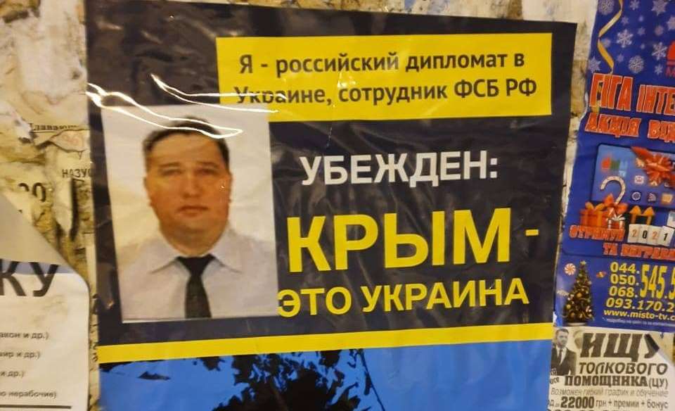 «Уночі проти 16 березня дипломати РФ, які перебувають в Україні (а за сумісництвом кадрові співробітники ГУ ГШ ЗС та ФСБ РФ) з’явилися на друкованих плакатах, де «від першої особи» визнали факт незаконної анексії Росією АР Крим. Ці плакати можна сьогодні побачити скрізь, де працюють та живуть російські дипломати — біля Посольства РФ в Україні. А дизайн автомобілів російської агентури значно покращили стильні тризуби», — йдеться в дописі Андрія Цаплієнка.
