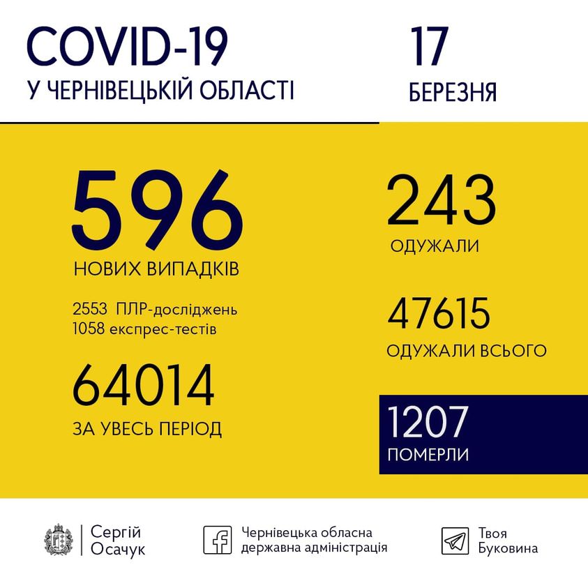 Від початку пандемії в області коронавірусом інфікувалися 64 014 буковинців. Одужали 47 615 осіб. А померли від ускладнень — 1207.