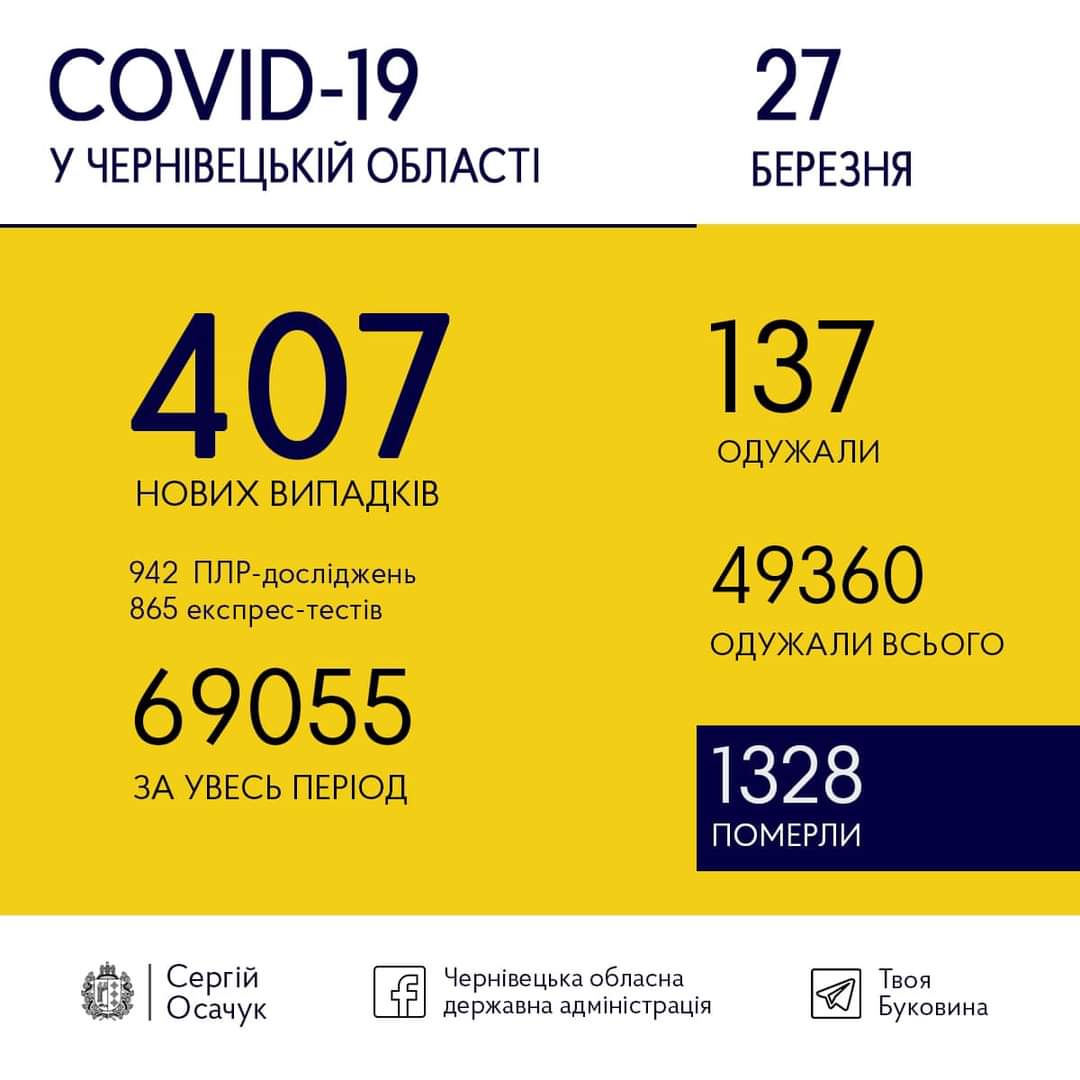 27 березня на Буковині виявили 407 нових випадків коронавірусу. Одужали за добу 137 людей.