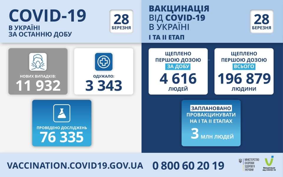 В Україні за минулу добу коронавірус виявили в 11 932 людей. Також 3 343 пацієнти одужали, а 203 — померли від ускладнень. Того ж дня шпиталізували 5 052 пацієнти із підозрою чи діагнозом COVID-19.