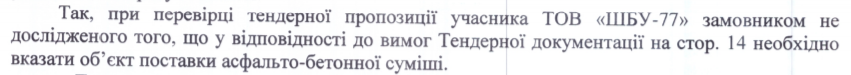 Проте радість чернівчан була передчасною. Бо вже 22 липня Антимонопольний комітет України задовольнив скаргу щодо ШБУ-77 від того ж таки ТОВ «Євродор» у зв’язку з тим, що київська фірма не вказала в тендерній документації об’єкт поставки асфальтно-бетонної суміші.