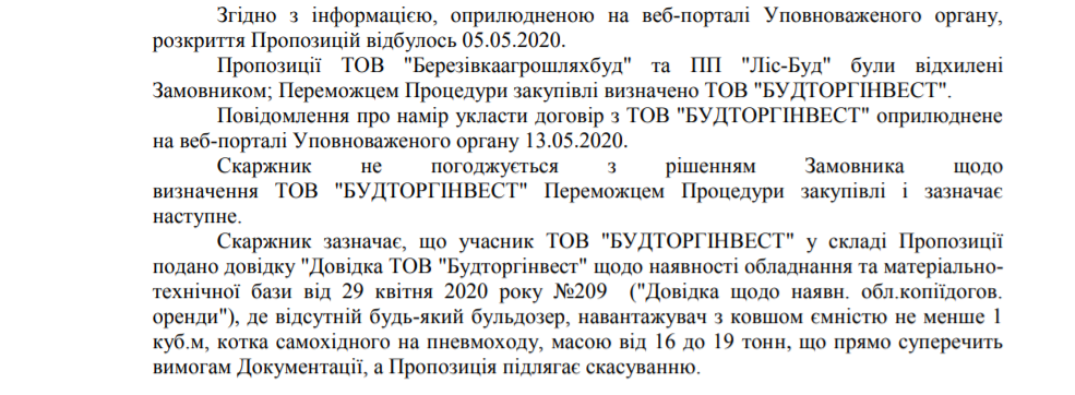 Та, як з’ясувалося, АМКУ отримав низку скарг від конкурентів у торгах та задовольнив одну з них – уже згаданої компанії «Євродор», яка до того цілий рік судилася за право ремонтувати Кармелюка. Миколаївська фірма поскаржилася на відсутність у переможця відповідної техніки для проведення робіт — бульдозера.