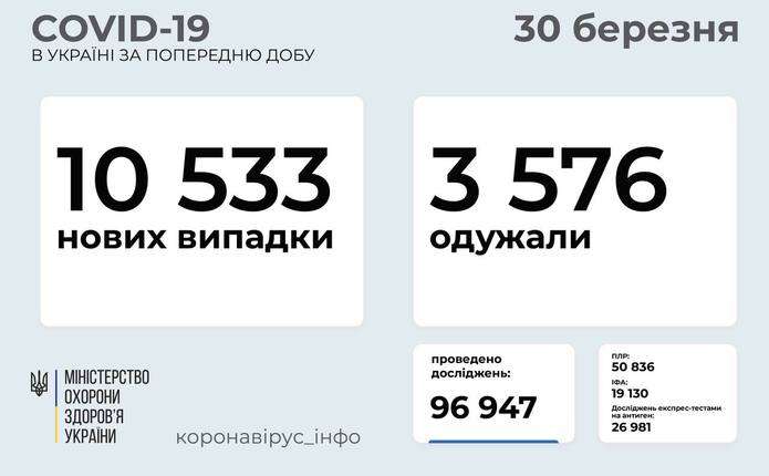 10 533 нових випадки коронавірусної хвороби COVID-19 зафіксовано в Україні станом на 30 березня 2021 року. Зокрема, захворіли 367 дітей та 250 медпрацівників. Про це інформує телеграм-канал Коронавірус Інфо.