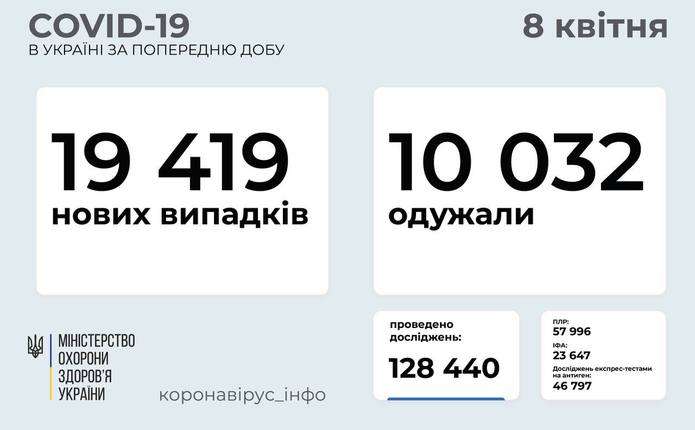 19 419 нових випадків коронавірусної хвороби COVID-19 зафіксовано в Україні станом на 8 квітня 2021 року. Зокрема, захворіли 766 дітей та 480 медпрацівників. Про це інформує телеграм-канал Коронавірус Інфо.