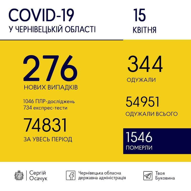 15 квітня на Буковині виявили 276 нових випадків коронавірусу.