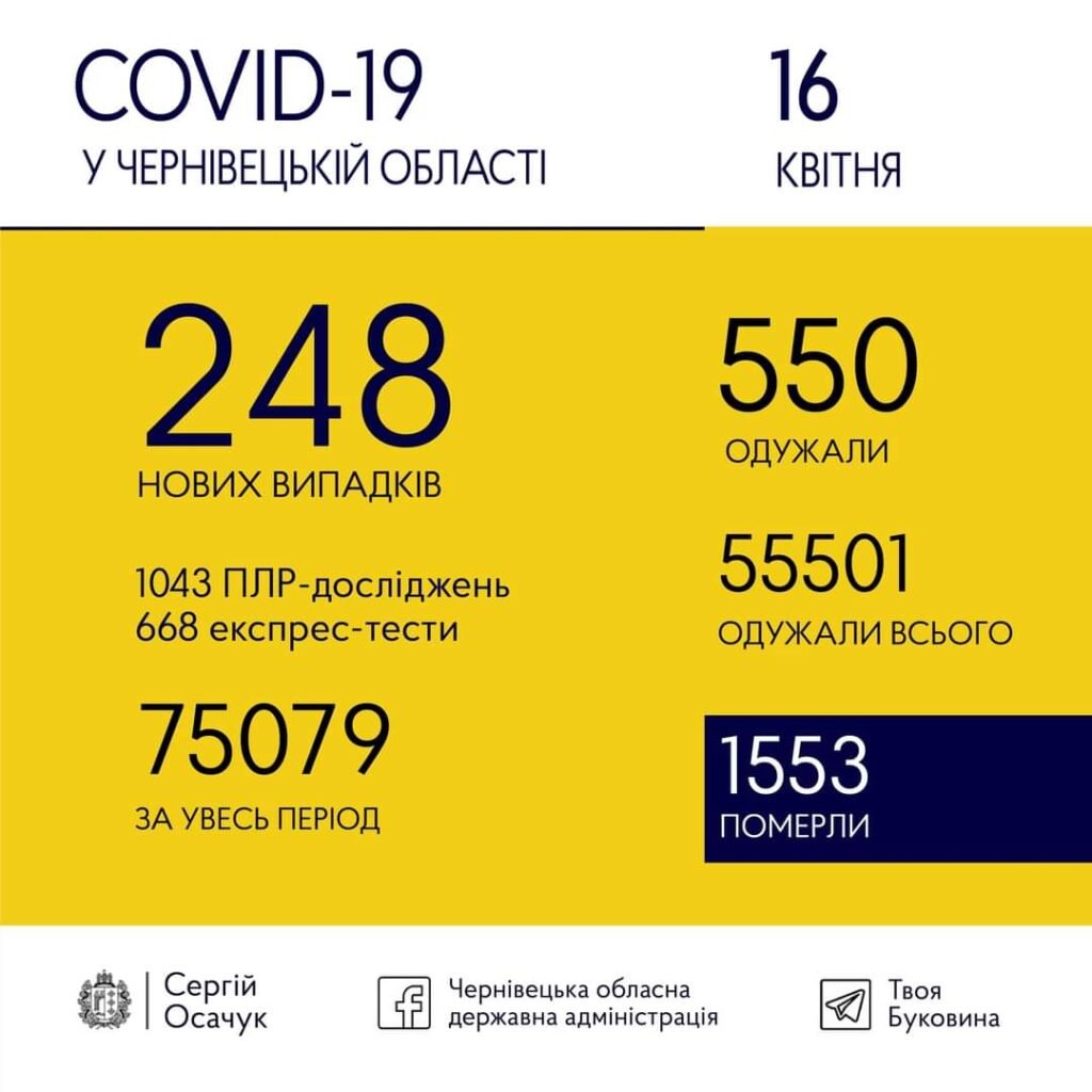 16 квітня на Буковині виявили 248 нових випадків коронавірусу. Одужали за добу 550 людей.