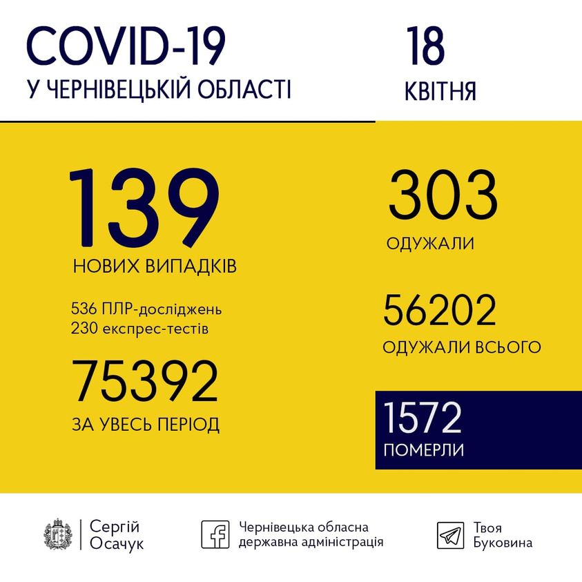 За весь період від початку пандемії тут зареєстрували 75 392 випадки COVID-19. Одужали всього 56 202 буковинці. А померли від ускладнень 1 572 особи.