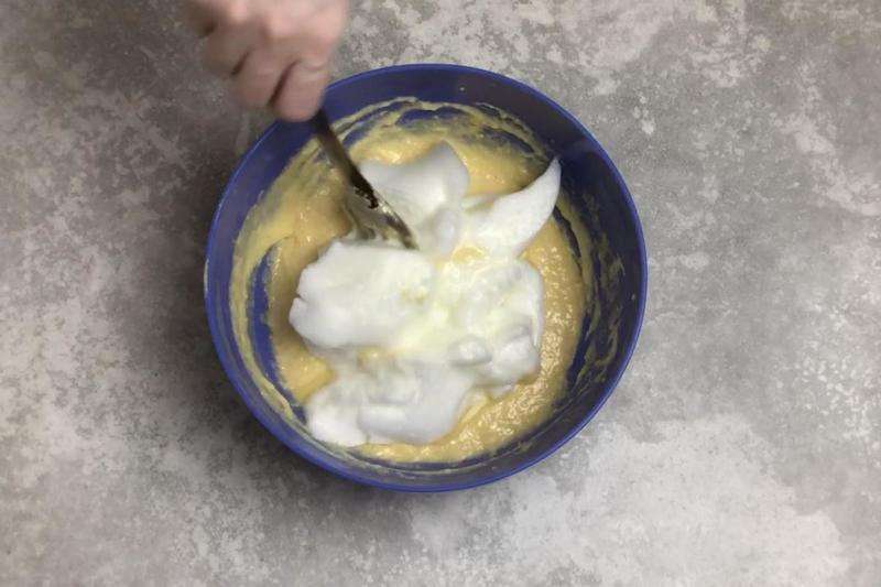 Яйця і масло дістати з холодильника заздалегідь, щоб вони нагрілися до кімнатної температури. Спочатку потрібно зробити опару. Половину борошна змішати з дріжджами. Влити тепле молоко і помішувати. Посуд з опарою накрити плівкою і прибрати в тепле місце на півгодини. Яйця розділити на білки і жовтки. Жовток збити з цукром і ванільним цукром до пишної світлої маси.