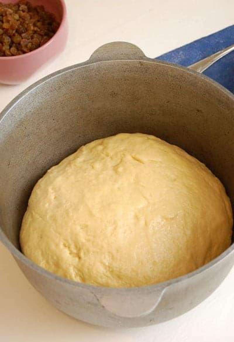 Тісто на пасху має бути м’яким і податливим. Посуд з тістом накрити рушником і прибрати в тепле місце на годину. Ізюм промити і залити гарячою водою на 15 хвилин. Обсушити і перемішати зі жменею борошна. Додати родзинки і замісити тісто ще раз, залишити на 10 хвилин.