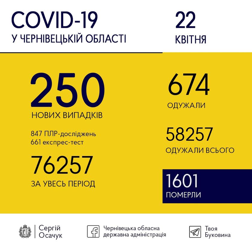 Від початку пандемії у Чернівецькій області зареєстрували 76 257 випадків. За цей час 58 257 людей одужали, а померла 1 601 особа.