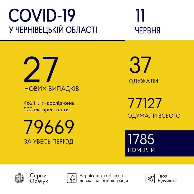 11 червня на Буковині виявили 27 нових випадків коронавірусу.