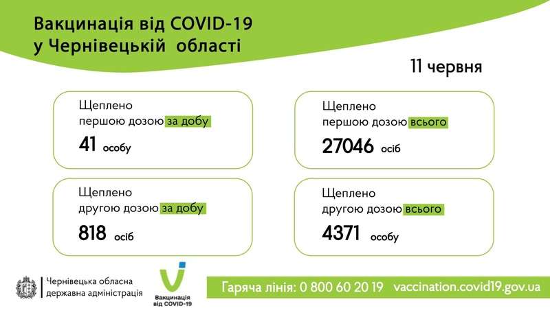 Загалом у Чернівецькій області від коронавірусу станом на 11 червня першою дозою вакцинували 27046 буковинців, другу дозу отримали 4371 особа.
