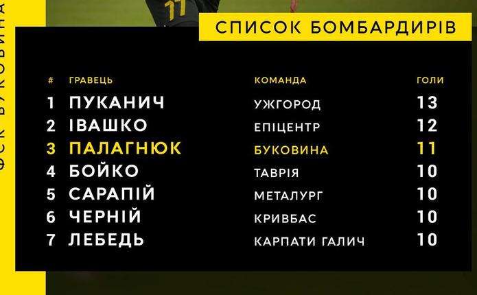Усього футболісти «Буковини» за сезон забили 27 голів. Відповідно 40.74% із них – на рахунку Палагнюка, йдеться у дописі ФСК «Буковина» на сторінці у facebook.