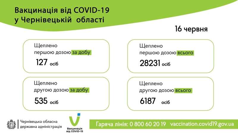 Загалом у Чернівецькій області від коронавірусу станом на 16 червня першою дозою вакцинували 28231 буковинця, другу дозу отримали 6187 осіб.