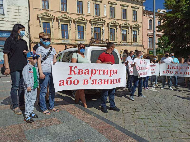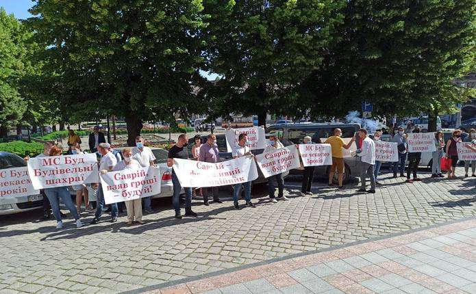 Люди стоять з плакатами “МС Буд, ми чекаємо 5 років”, “Саврій, де наші кварти?”, “Саврій, взяв гроші – будуй!”, “МС Буд – будівельні шахраї”, “Квартири або в’язниця”.