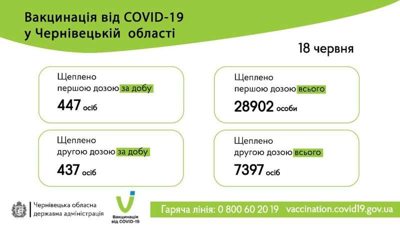 Сьогодні, 18 червня, на Буковині першу дозу отримали 447 осіб. Другою дозою щеплено 437 людей.