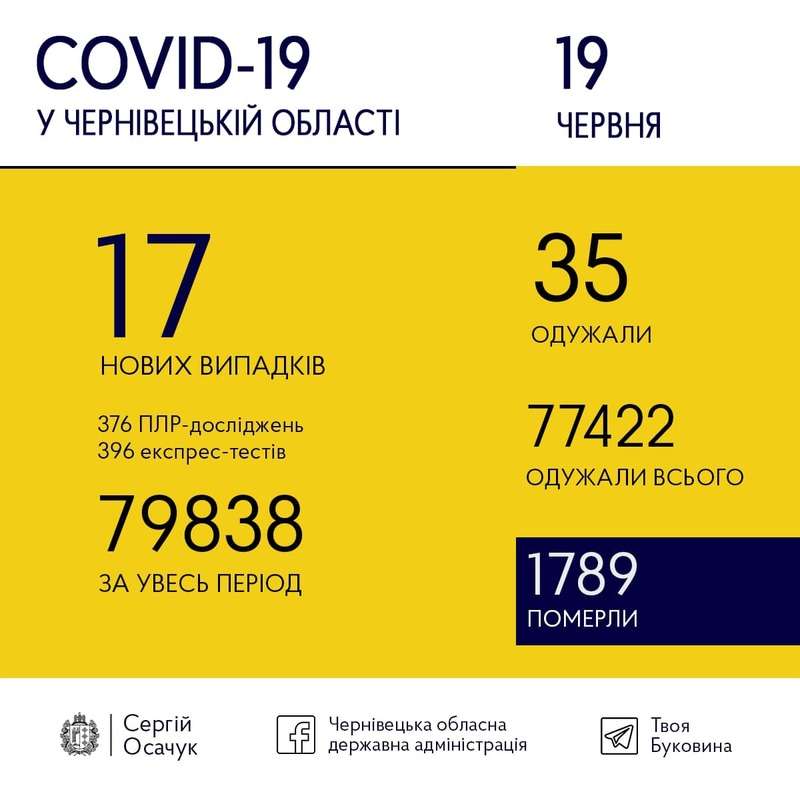19 червня на Буковині виявили 17 нових випадків коронавірусу.