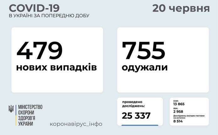 479 нових випадків коронавірусної хвороби COVID-19 зафіксовано в Україні станом на 20 червня 2021 року. Зокрема, захворіли 15 дітей та 6 медпрацівників. Про це інформує телеграм-канал Коронавірус Інфо.