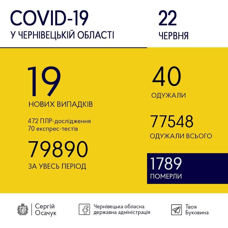 22 червня на Буковині виявили 19 нових випадків коронавірусу.