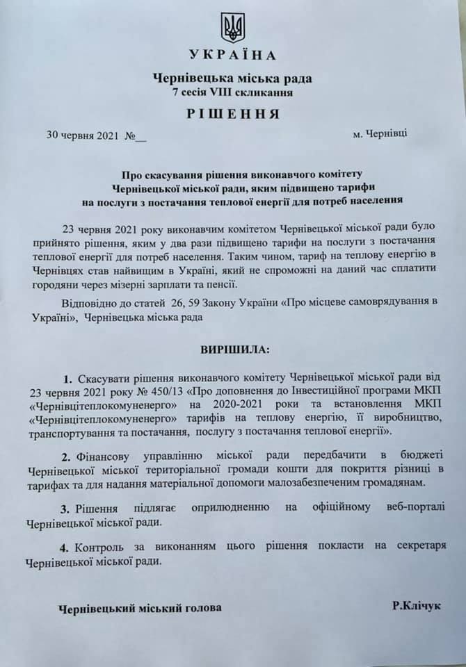 «23 червня 2021 року виконавчим комітетом Чернівецької міської ради було прийнято рішення, яким у два рази підвищено тарифи на послуги з постачання теплової енергії для потреб населення. Таким чином, тариф на теплову енергію в Чернівцях став найвищим в Україні, який не спроможні на даний час сплатити городяни через мізерні зарплати та пенсії», – йдеться у тексті документу.