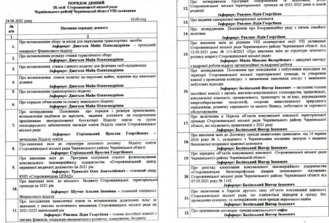 24 червня 2021 року відбулася ІХ сесія Сторожинецької міської ради VIII скликання. На порядку денному було 50 питань.