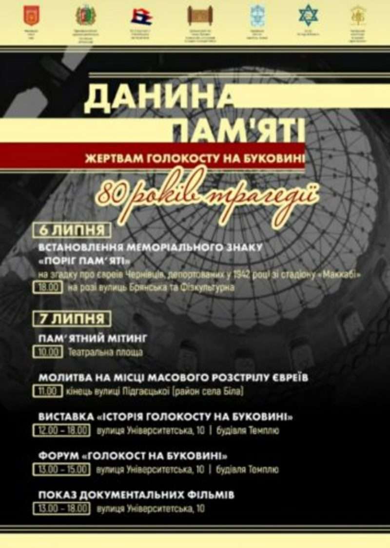 З метою відзначення 80-х роковин та вшанування пам’яті жертв Голокосту в Чернівцях запланована широка програма меморіальних заходів, які проходитимуть 6-7 липня.