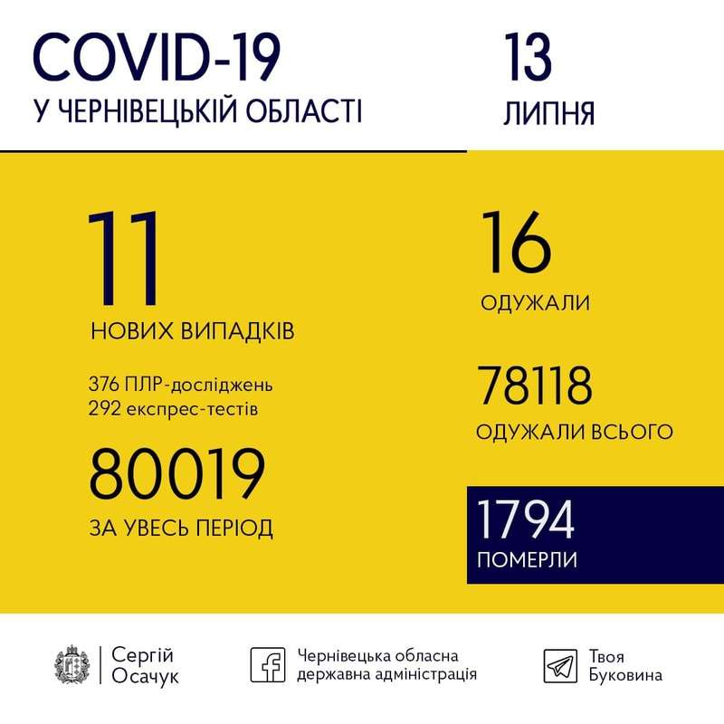 13 липня на Буковині виявили 11 нових випадків коронавірусу.