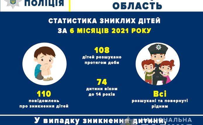 За цей період до поліції надійшло 110 повідомлень про зникнення неповнолітніх буковинців, які самовільно вийшли з дому та не повернулися. Поліцейські оперативно відреагували на ці звернення та відшукали всіх зниклих дітей, 98% з них – протягом доби. Здебільшого їх вік становить до 14 років.
