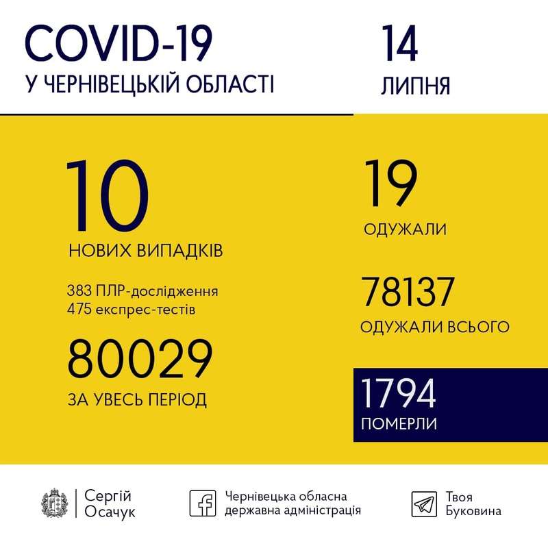 14 липня на Буковині виявили 10 нових випадків коронавірусу.
